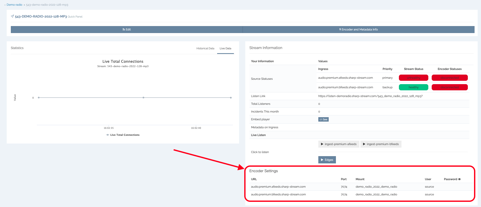You can find the encoder details at the bottom of the Stream Information panel on the Mount page. To reveal the password, click the eye icon.